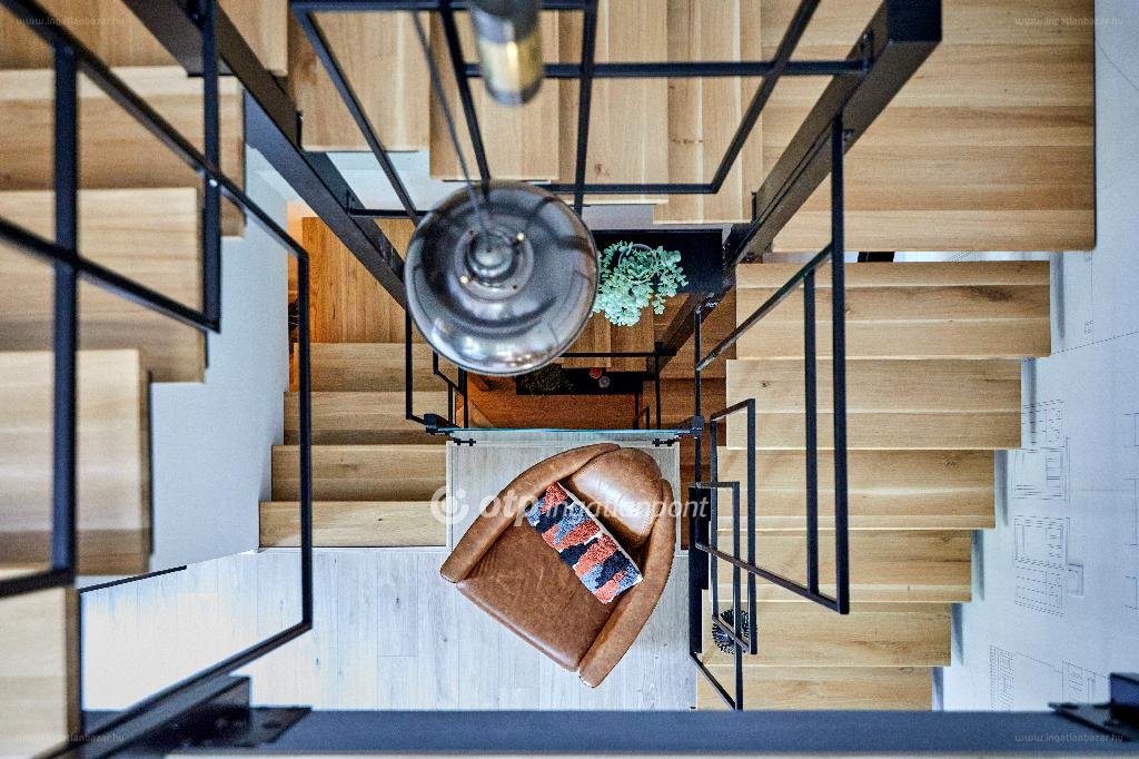 A földszinten található WC-s, zuhanyzós fürdőszoba végében külön hely van a mosógépnek és szárítógépnek. A fürdőszobán két ablak is van, melyek gondoskodnak a megfelelő fényről és szellőzésről. A szinteket egy különleges kivitelű kényelmes fekete fém lépcső köti össze, mely szintek között teljes egészében átlátjuk a ház mintegy 8,5 méteres belmagasságát. A padlás felé haladva félúton jutunk a gardróbba, majd a lépcsőn tovább menve érkezünk a minden női szívet bizonyára rabul ejtő hálórészbe. Itt nem csak a ház falát díszítő három keskeny kis ablak teszi romantikussá a teret, hanem az éjszaka szemünk elé táruló csillagos égbolt is, melyet a 2 és fél méter magas, kis erkéllyé nyitható tetőablakon keresztül csodálhatunk az ágyból fekve.