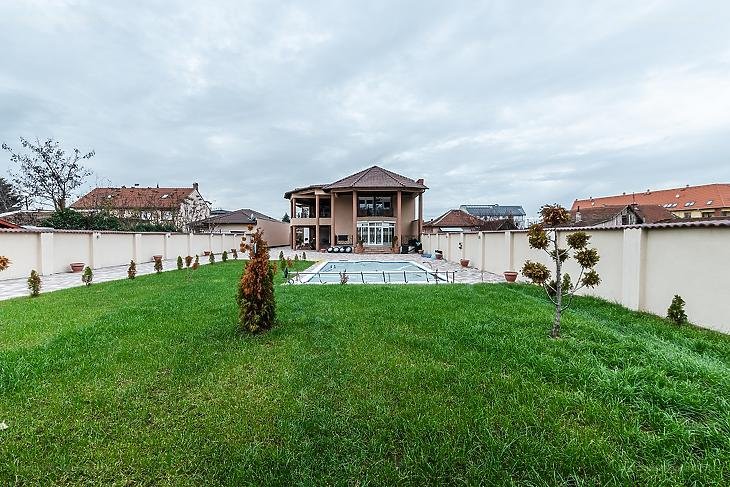 “Szolnok központi részén eladó 1228 m2-es telken, 490 m2-es, két generációs, 7 szobás családi ház, összesen 110 m2-fedett terasszal, 150 cm mély medencével, zárható garázzsal.