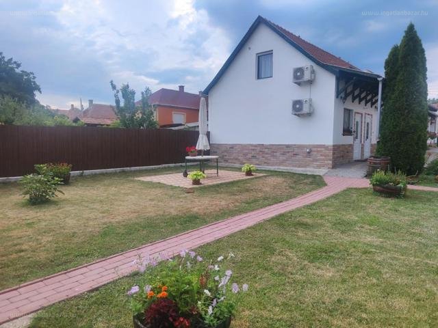 “Egerszalók központi részén tornácos parasztház eladó. Jelenleg a hátsó része teltházas vendégházként üzemel. Az ingatlan telek területe 989 nm, lakóház 188/165 nm. Tető fedése cserép. Falazata az első lakrészben tufa 1960-as építésű. Elosztása nappali+konyha+étkező, szoba, fürdőszoba+toalett, fedett tornác. Folytatásban 2005-ben hozzá építettek falazata tégla. Két külön bejáratos. Alsó szinten 2 apartmant alakítottak ki.