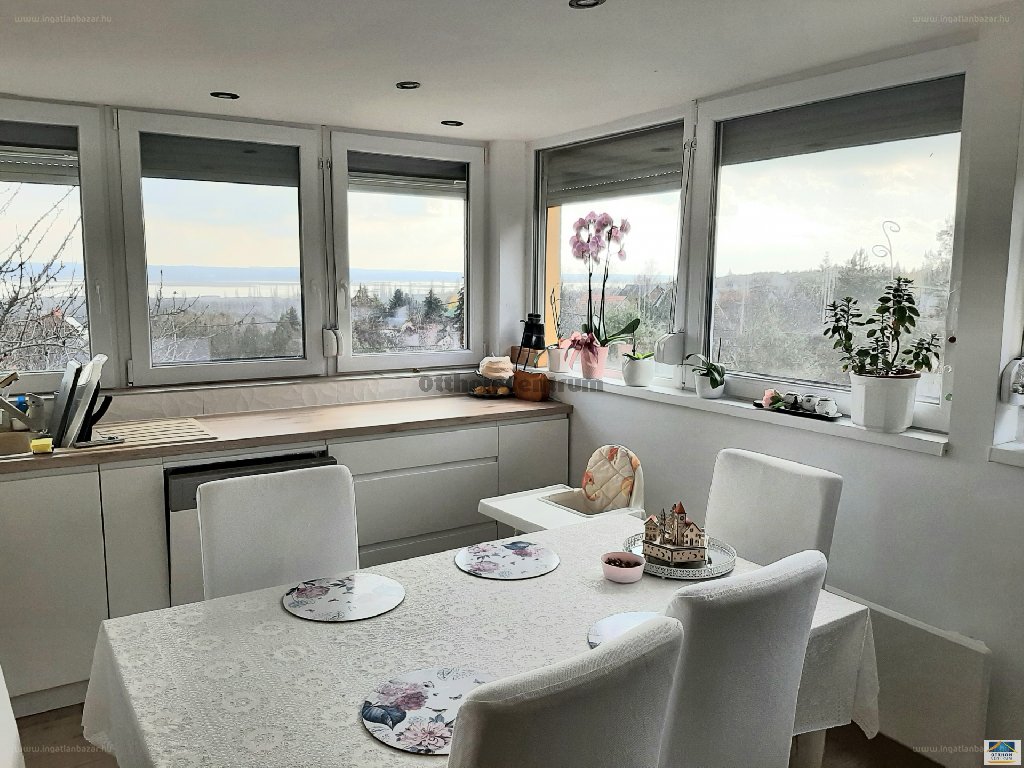 A ház mögötti teraszról belépve a házba elénk tárul egy galériás nappali egy hangulatos, egyedi építésű kandallóval, valamint az egybenyitott, fényben úszó, étkezős konyha, ahonnan csodás panoráma tárul elénk a Velencei-tóra. Ezen a szinten található még egy dolgozószoba, egy külön wc kézmosóval, egy káddal és zuhanyzóval is felszerelt fürdőszoba, valamint az étkezőből is közvetlen megközelíthető terasz. A galéria szintjén két hálószobát alakítottak ki és egy zuhanyzót wc-vel.