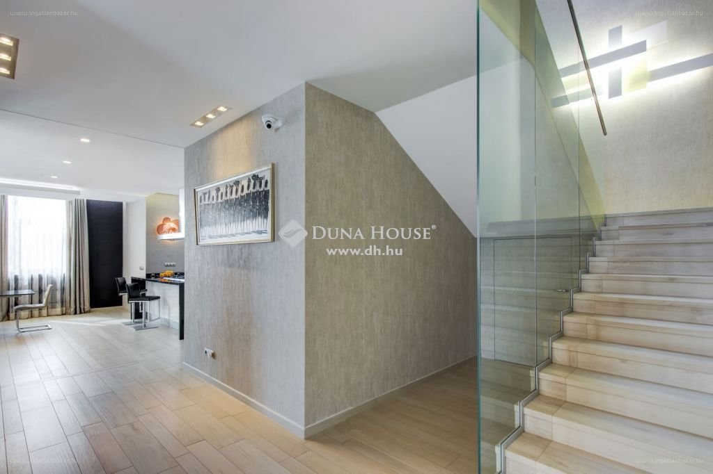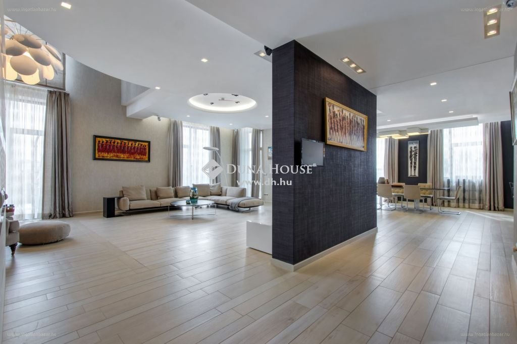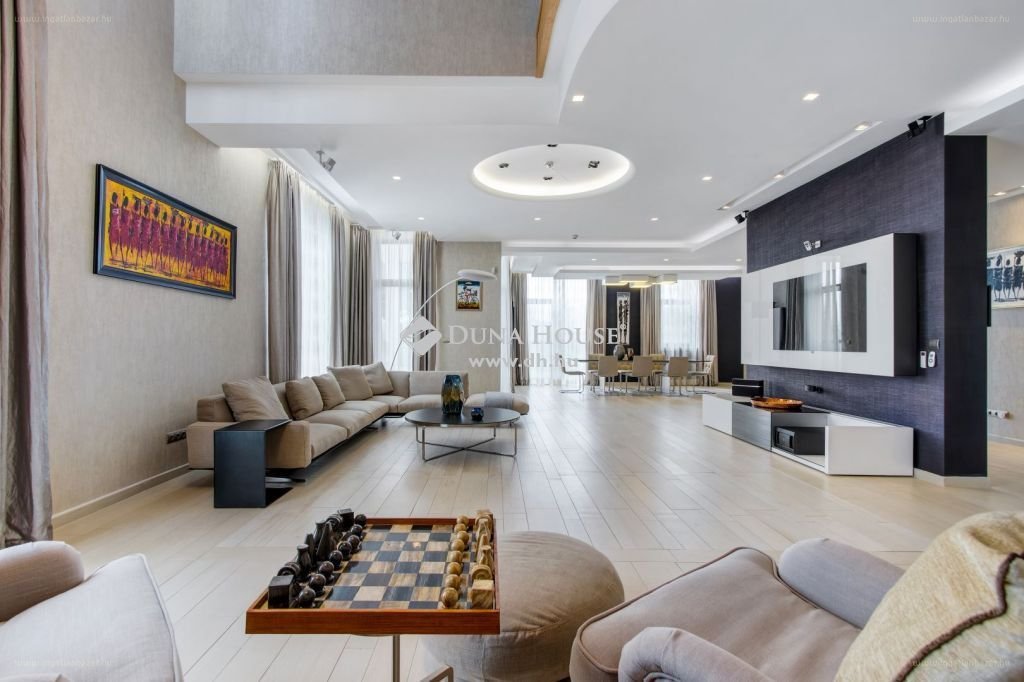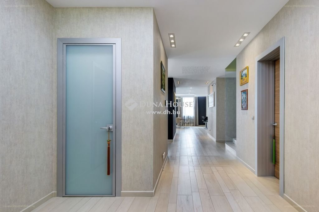 “Az eladásra kínált ingatlan egy több mint 7600 négyzetméteres területen fekszik, melynek egyedi, teraszos kialakítása izgalmas kertészeti- és tájépítészeti megoldások megvalósítását tette lehetővé. A kertnek több érdekes eleme van. Egyik ezek közül egy impozáns méretű, víztisztító rendszerrel is ellátott mesterséges tó. A másik különlegesség a fűthető, világító, ellenáramoltató rendszerrel, önműködő tetővel, valamint a család legkisebb tagjainak örömére egy igazi AQUAPARK-csúszdával is ellátott úszómedence. A kert szépségéről a szabályozható automatikus öntözőrendszer gondoskodik. A gyümölcs- és díszfák öntözése saját kútból, valamint egy 50 köbméteres víztározóból történik. A ház és a kert organikus kapcsolatát a különböző szinteken található teraszok nyújtják. Ezek között találunk egy hatalmas, panorámás kilátó teraszt jakuzzival, de egy kültéri olasz tűzhellyel ellátott komplett grill-konyhát is, tágas térrel és komplett felszereléssel! A teraszok mindegyike luxus minőségű, 5 csillagos hotelekben használt DEDON márkájú kerti bútorokkal és napozóágyakkal berendezve kerül értékesítésre.