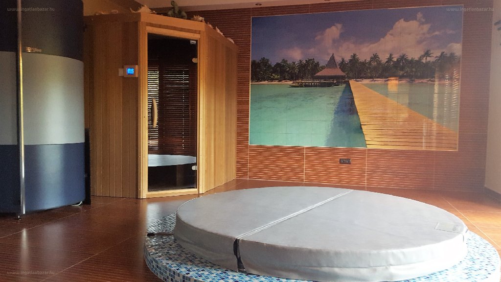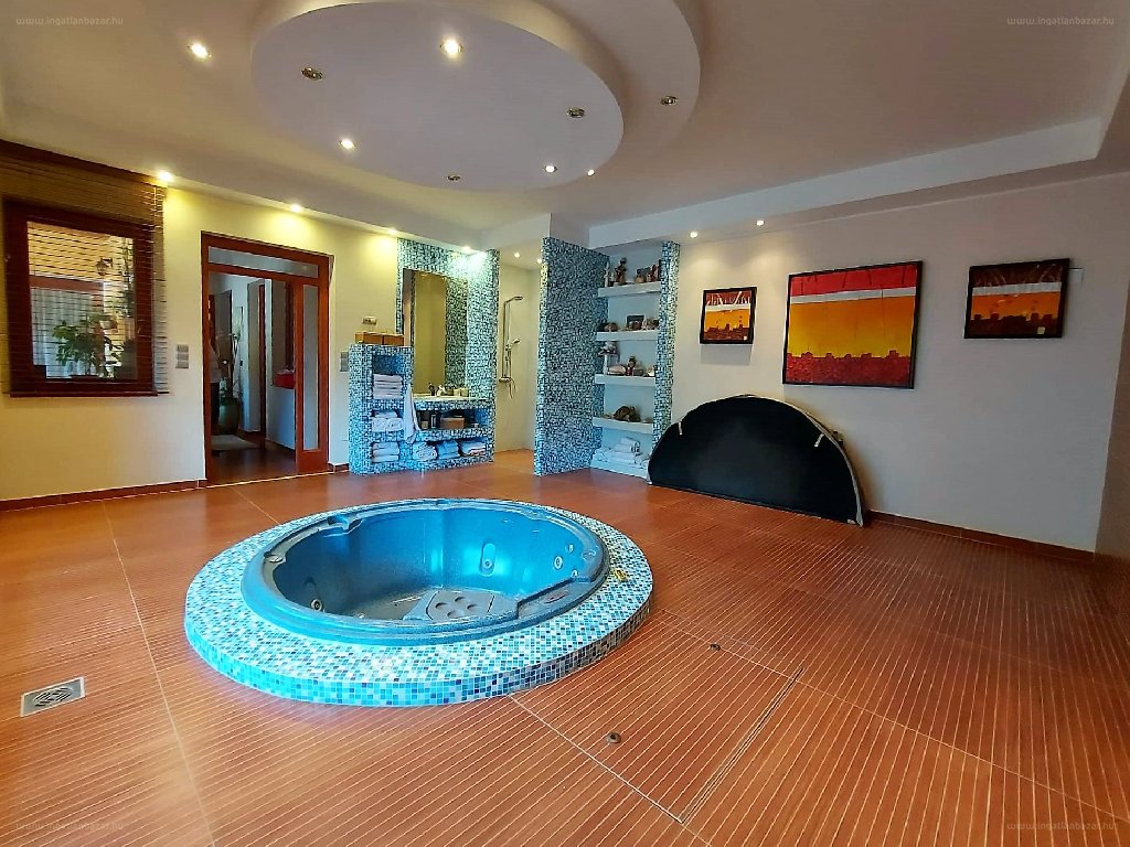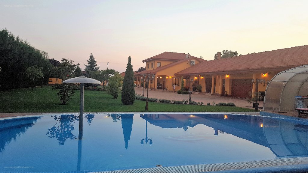 “Szolnoktól 40 km-re, Túrkevén, a horgásztó közelében eladó 450 m2-es, luxus családi ház, wellnes részleggel. 4000 m2-es telken, 2007-ben, téglából épült ez a rendkívül igényes, hangulatos önálló, 2 szintes családi ház. Hatalmas üvegfelületek rendkívül tágas és világos érzettel töltik meg az egész házat. A teljes biztonságról kiépített kamera és riasztórendszer gondoskodik.