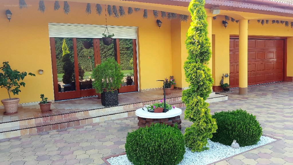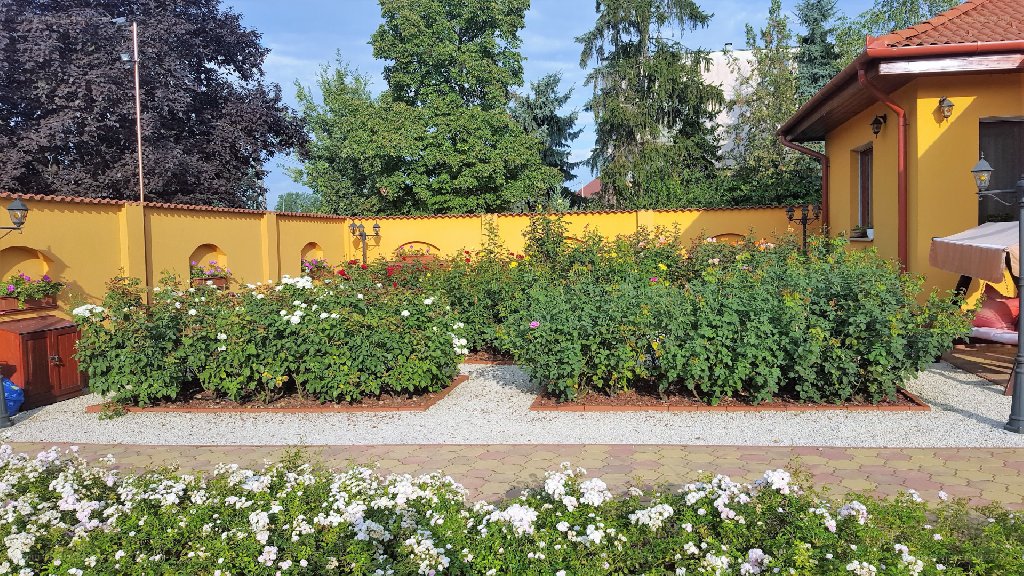 - A kert gyönyörűen parkosított, díszcserjékkel, rózsákkal, tujákkal beültetett.