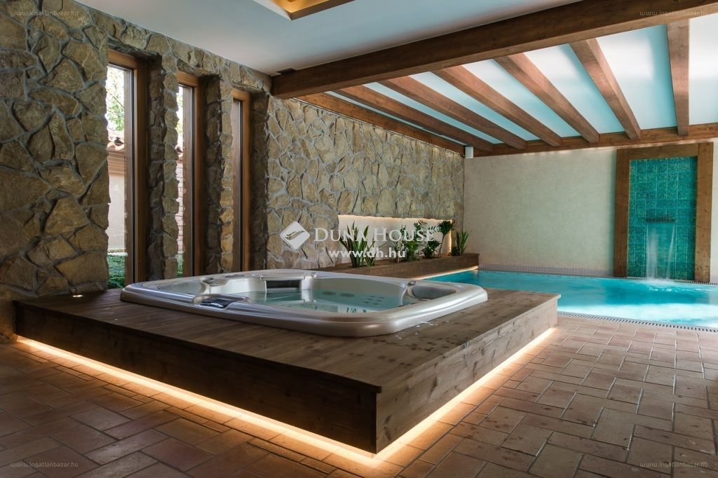 Különleges növények, minden évszakban virágzó fák, bokrok, cserjék színkavalkádja, gyermekjátszó teszik az itt eltöltött időt felejthetetlen feltöltődéssé.Az ingatlant egyedivé teszi a földszinten lévő wellness rész, amely beépített feszített tükrű medencét ( 8 × 4 m), jacuzzi-t, pihenőteret, infra szaunát és külön konditeremet foglal magába.A tulajdonos az egyszerűbb kezelhetőség miatt az ingatlant társasházzá alakította, mely a következő egységeket foglalja magába:Egy nagy méretű gépház ami az alagsorban található, két iroda blokk teakonyhával, illetve egy 3 állásos garázs , végül egy prémium kategóriás lakrész (3 szoba+ nappali+konyha+ fürdők), plusz egy full-extrás wellness-részleg, ami a tulajdonosok kényelmét szolgálja.Az ingatlan egy időtálló, meleg hangulatú, családbarát, madárcsicsergős otthon sok-sok különlegességgel, minden igényt és kényelmet kielégít. Itt minden megtalálható amire egy igényes család vágyhat! [...]”