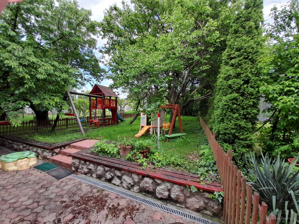 Az étkezőhöz csatlakozik az udvar felé a keleti fekvésű terasz, melyről csodaszép a kilátás az ősfákkal beültetett parkszerű kertre. Itt elfogyasztani a reggeli kávét, hallgatva közben a madárcsicsergést.... varázslatos. Ezen a szinten található még egy kisebb szoba, melyben egy szauna került elhelyezésre az ott lakók kényelme miatt. A tetőtéri szinten 4 hálószoba egy hatalmas, sarokkáddal, bidével felszerelt fürdőszoba található. Az udvar felőli, nagy, keleti fekvésű erkély mindegyik szobából megközelíthető.