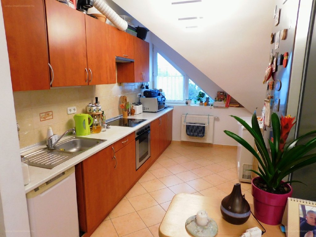 Az eladásra kínált lakás a tetőtérben van, az ötödik emeleten, másik három lakással egyetemben. A liftes lépcsőházból egy zárt előtéren keresztül közelíthetőek meg a lakások. A lakótér alapterülete 76 m2, a nettó lakótér 67 m2-es, azonban a lakás minden négyzetcentimétere abszolút kihasználható. Központi helyet foglal el az étkező, amiből a többi helyiség nyílik. A konyha valójában egy légtérben van a konyhával, mindössze egy pult választja el őket egymástól. Önmagában a konyha is kényelmes méretekkel rendelkezik.