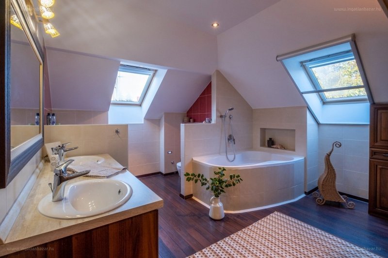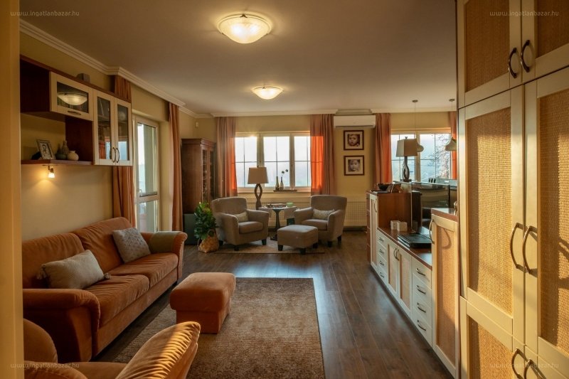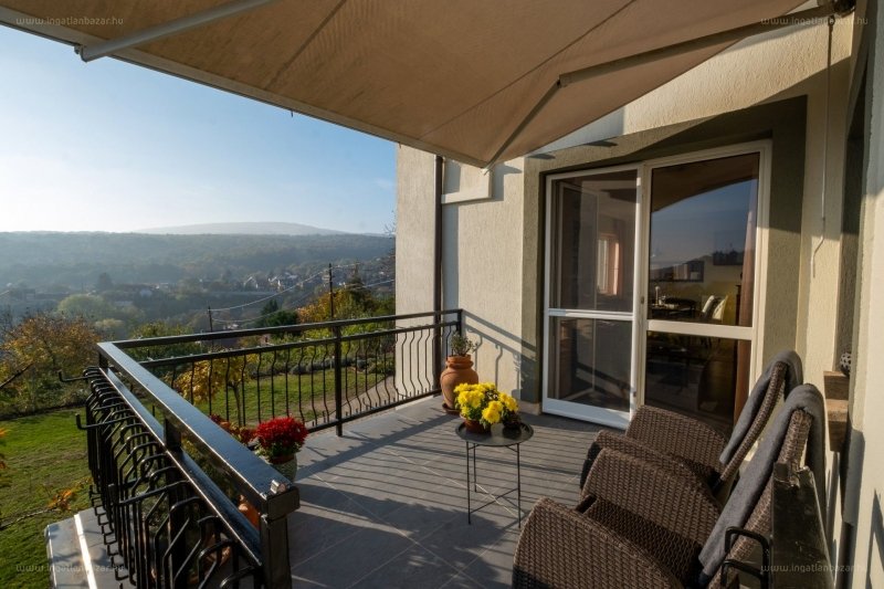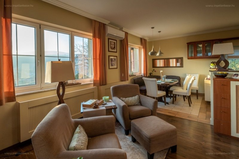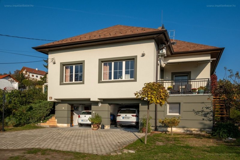 A legalsó szinten dupla garázs, mosókonyha és egy kondiszoba található. Az tökéletesen megtervezett, kivitelezett és igényesen berendezett otthon a garázsból és a főbejáraton keresztül is elérhető. Az első szinten egy tágas előszoba, 46 m2-es nappali + konyha, kamra, hálószoba, dolgozószoba, zuhanyzós fürdőszoba és egy külön illemhely található. A nappaliból nyílik egy kertkapcsolatos, hangulatos terasz Jakab hegyi panorámával. A felső szinten közlekedő, két hálószoba, egy gardrób és egy nagy fürdőszoba található 2 személyes infraszaunával.