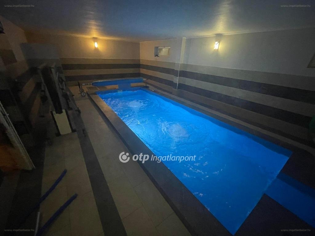 Az alsó szinten 32 m2-es dupla garázs, 28 m2-en kazánház, 83 m2-es helyiségben zuhanyzó és toalett,és egy relaxálásra, pihenésre kiváló, 2,8 x 8 m -es, medencét építettek be áramoltatókkal, buzgárokkal, derékmasszázzsal biztosítva a kellemes ellazulást, kikapcsolódást.