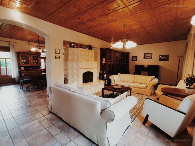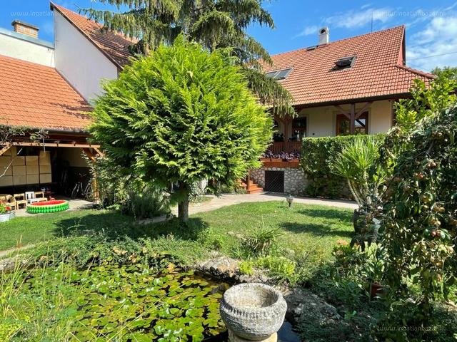 A melléképületben lévő tárolók, és 3 beállós garázs fölött tt-i 1 szobás apartman van kialakítva. Az udvar részben térkövezett, részben parkosított(öntöző rendszer kiépítve, fúrt kútról müködtethető) A ház fűtését a pincében található gázkazán, ill. a nappaliban található cserépkályha biztosítja. A földszint padlófűtéssel, az emeleti szobák radiátoros fűtéssel. [...]”