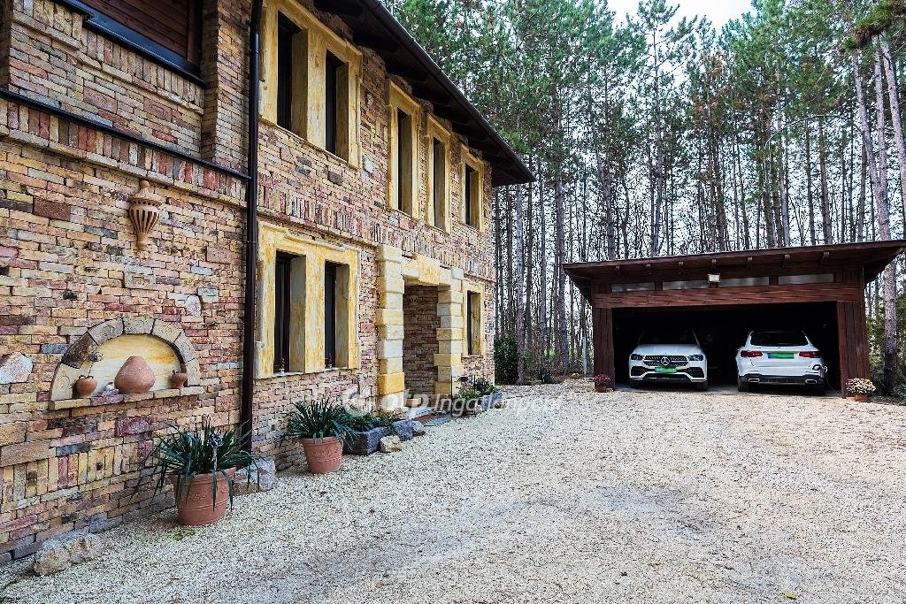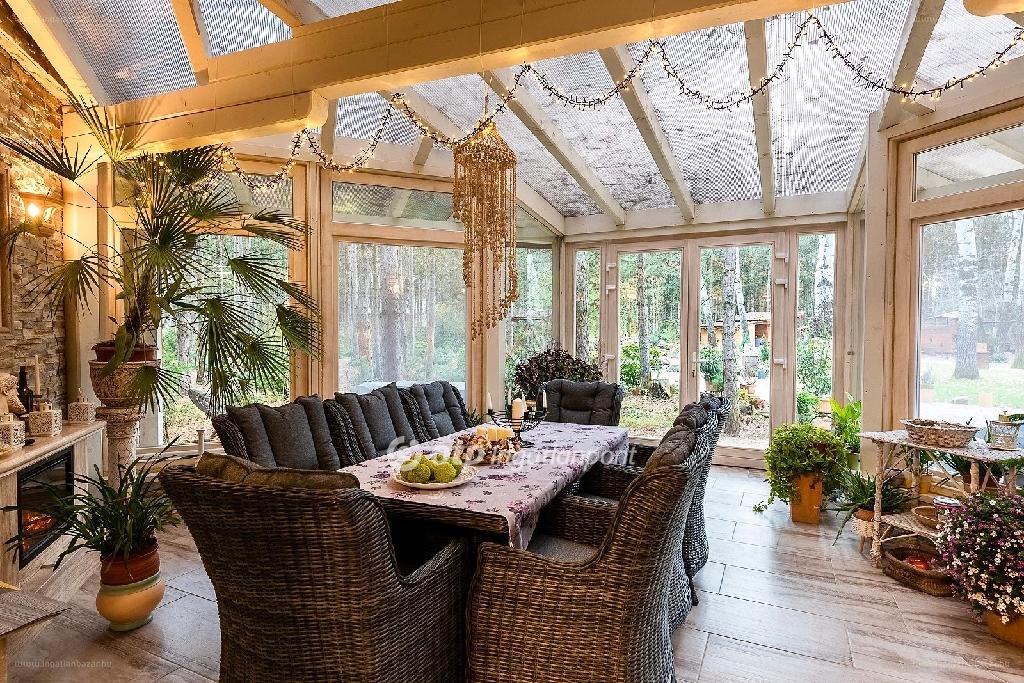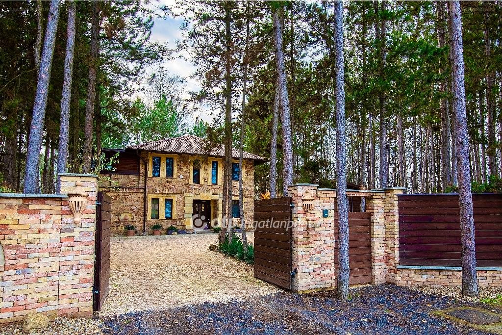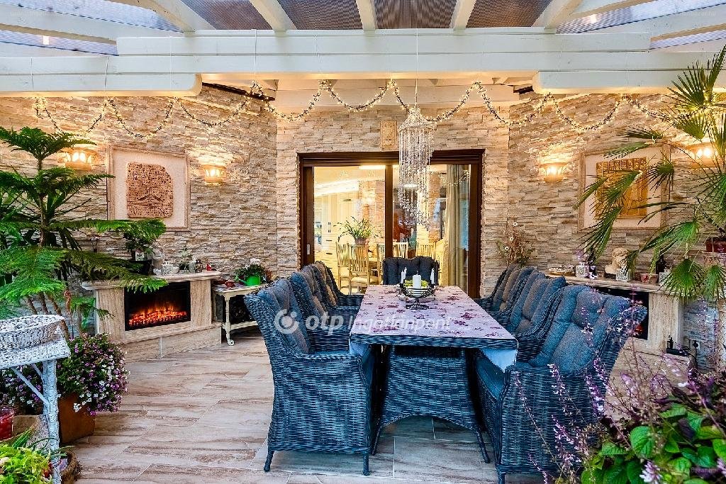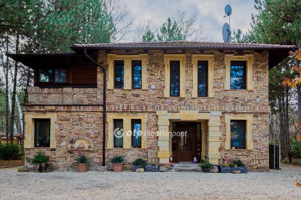 Déli tájolása miatt napos, világos terek jellemzik. Télikertben hideg napokon 2 látványkandalló biztosítja a kellemes hőmérsékletet. Gyönyörű parkosított udvarban kialakításra került az öntözőrendszer és kerti tó is. Nyáron a fedett grillező és sütögető biztosítja a családi és baráti összejövetelek helyszínét. Ezen kívül egy nagyon hangulatos borospincével is rendelkezik az ingatlan. Gépkocsi tárolására a fedett autóbeállóban van lehetőség, amelyben 2 elektromos autó töltése biztosított. Az udvarban még egy tároló és játszótér is megtalálható. Az ingatlan szomszédságában több hektár fenyőerdő van. Elektromos kapunyitó rendszer teszi kényelmessé a közlekedést. Beton pilléres kerítését vörösfenyő elemek díszítik. Nagyon szép környezetben található a családi ház, csendes és nyugodt életet biztosít, mégis közel, 90 m-re a főúttól. [...]”