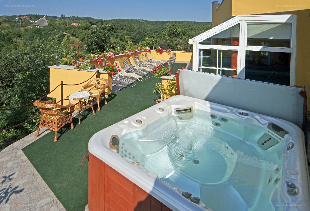 „Festői környezetben Velencei tóra panorámás wellness hotelnek is alkalmas villa! [...] Az épület 1989 és 1994 között épült példátlan igényességgel, egyedi megoldásokkal, időtálló klasszikus stílusban és technológiával, az egyedi és különleges adottságú telek tulajdonságainak tudatos kihasználásával. Két épületszárnyra tagolt, ennek köszönhetően két különálló épületként is funkcionálhat, akár ketté is osztható.
