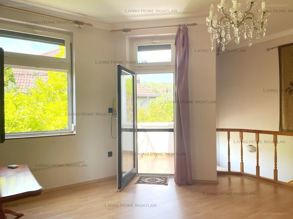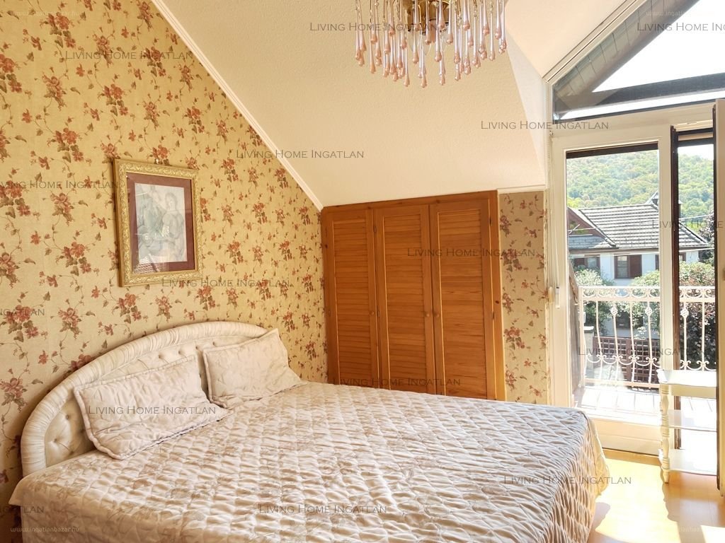 Az ingatlan 1992-ben épült egy 470 nm-es telken, 4 hálóból és 2 nappaliból áll. Beosztása: Földszint: előtér, amerikai konyhás nappali kandallóval, hálószoba, különálló, bútorozott gardrób helyiség, kádas fürdőszoba, külön WC. A tágas, világos, nagy ablakos nappali teraszkapcsolatos. Emelet: Egy kisebb nappaliból nyílik 3 hálószoba, melyekhez 2 erkély kapcsolódik, bútorozott gardrób, kádas fürdőszoba, külön WC. A gardróbból ki lehet alakítani egy konyhát, a szerelvényezés már megtörtént, így a ház kétgenerációssá tehető. A nappaliból juthatunk fel a padlásra Meisterholz feljáróval. Gyönyörű, panorámás kilátás nyílik a hálók ablakaiból, valamint az erkélyekről. Szuterén: Egyállásos garázs elektromos kapuval, szauna pihenő helyiséggel, tusolóval, kisebb konyha, tárolók, kazánház, mosókonyha, széf. Az udvar karbantartott, az előkertben virágok, bokrok vannak ültetve, a hátsó, intim kert nagyrészt füvesített, bokrokkal körbe ültetett, valamint egy fából készült pergola is helyet kapott.