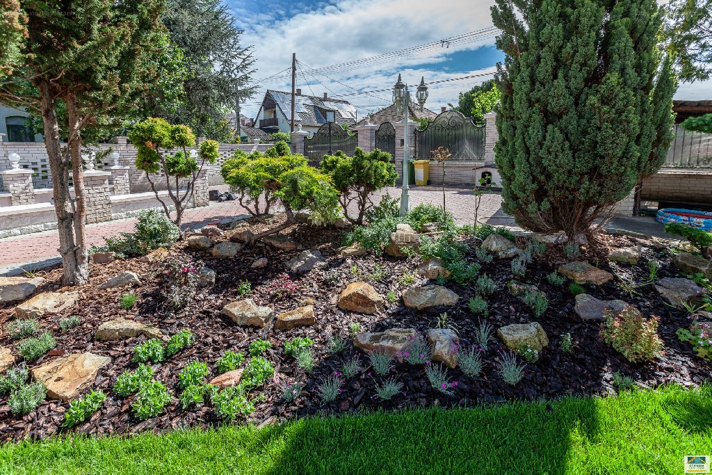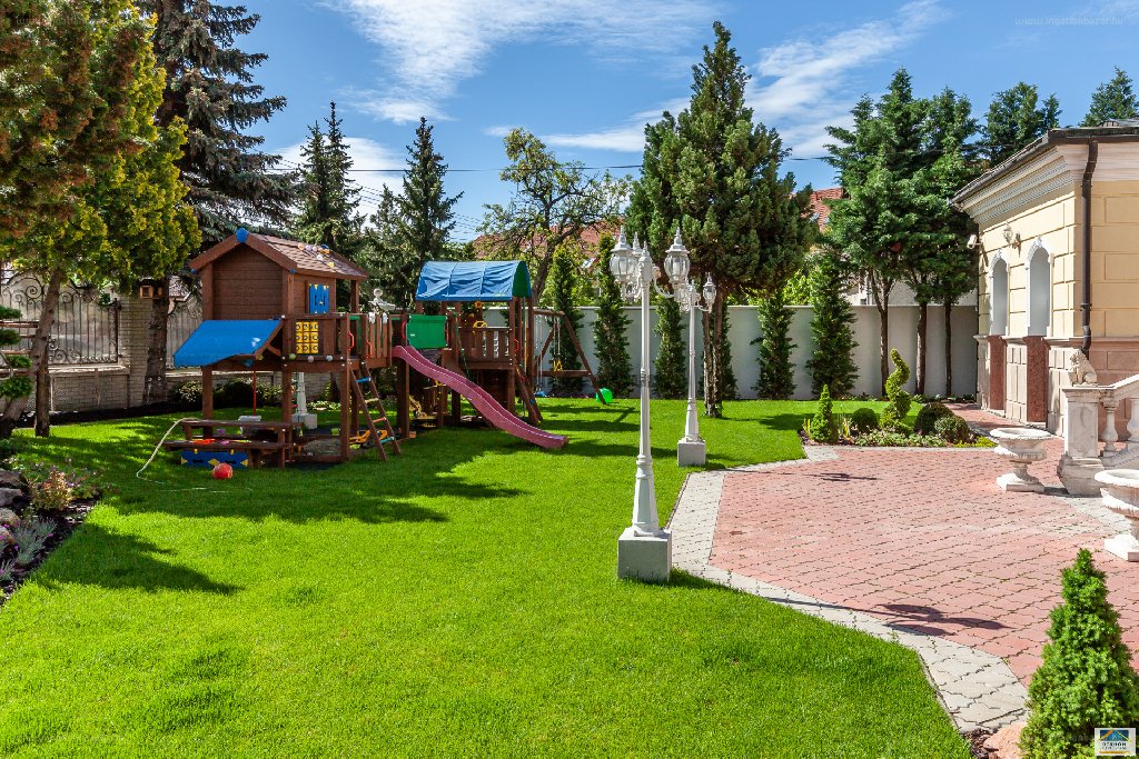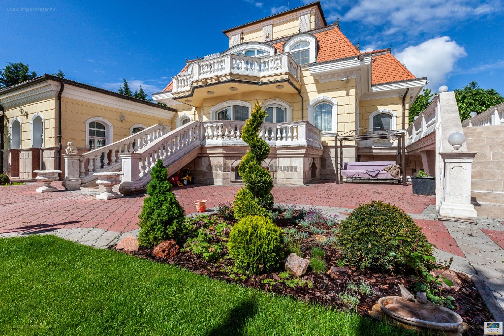 " [...] Gyönyörűen gondozott, dísznövényekkel beültetett parkosított kerten fekszik, melynek öntözéséről automata öntözőrendszer gondoskodik. A kerti utak fagymentesítését, ide értve a garázsbejárathoz vezető térburkolt lejárót is devirteg berendezések telepítésével biztosították. Az épület exkluzív kialakítású, kastélyszerű, funkcionálisan családi ház, melyben elrendezése révén egymástól független, szeparált lakórészek kerültek kialakításra.