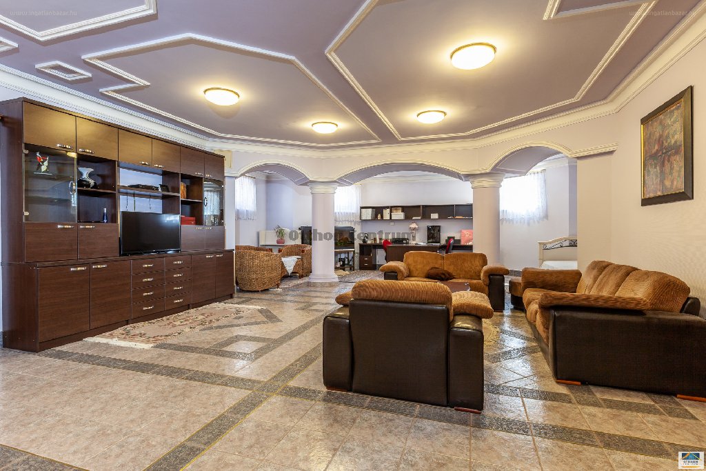 A házba érkezve diófagyökér-betétes ajtókon keresztül jutunk a gyönyörű cseresznyefa konyhába, melyet az ebédlő köt össze a gránitburkolatú, kézzel készített kandallós hatalmas méretű nappalival/ társalgóval. A nappali térből üvegfalon át nézhetők az egy szinttel lejjebb lévő feszített víztükrű , ellenáramoltatós, kertkapcsolatos medencében fürdőzők. A medencéhez külön fürdőszoba, egyedi szauna és hideg vizes merítőmedence tartozik. A társalgó szintjén helyezkedik el ,még a szülői lakosztály saját fürdőszobával és gardróbbal valamint 2 hálószoba közös fürdőszobával és az előszobából nyíló vendéggardrób illetve a vendégeknek fenntartott tágas illemhely kézmosóval. Az emeleti szintre gyönyörű, egyedi kézzel készített kovácsoltvas korlátokkal felszerelt márvány burkolatú lépcsősor vezet, ez a szint is fel van szerelve egy modern konyhával, étkezővel, gyönyörű napfényes társalgó-nappalival valamint 3 saját fürdőszobás hálószobával és egy dolgozószobával. Egy szinttel feljebb került kialakításra az jelenleg könyvtár/ kávézóhelység melynek teteje teljesen nyitott, hangulata ámulatba ejtő, ebben a szobában a napi problémáktól eltávolodva belefeledkezhetünk a könyvek elvont világába miközben pihenőidőnket töltjük egy csésze hondurasi kávé társaságában.