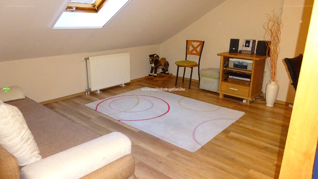 - alsó szinten: nappali-konyha, egy hálószoba, fürdőszoba+Wc, felső szinten: közlekedő beépített szekrénnyel, egy hálószoba.