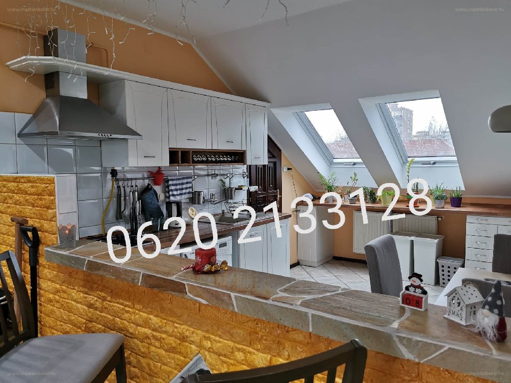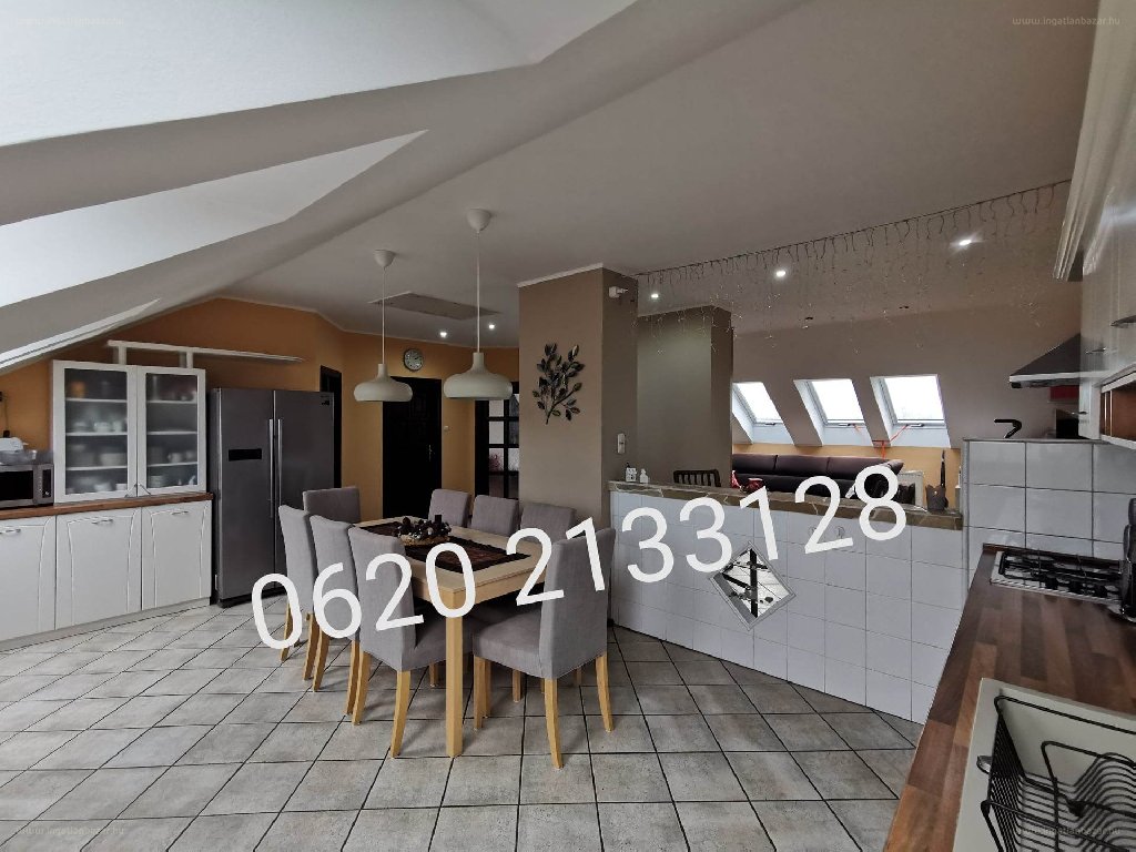 „Dunaújvárosban, a Bocskai István utcában 3 szobás+amerikai konyhás nappalis tetőtéri tégla lakás eladó! A lakásnak 112 m2 nettó-133 m2 bruttó az alapterülete. A lakás szigetelése 20cm kőzetgyapot, szintén kőzetgyapot szigetelésű a térdfal, lépésálló 4cm-es xps szigetelés az aljzatban, új szigetelt háromrétegű műanyag ablakok vannak beépítve, minden ablakon Velux fényzáró roló világos bézs színben, energiatakarékos a lakás. A fűtés egyedi szabályozható saját igény szerint a gáz vagy az elektromos klímás fűtés-hűtés kombinálható, 3 db hűtő fűtő klíma van a lakásban.