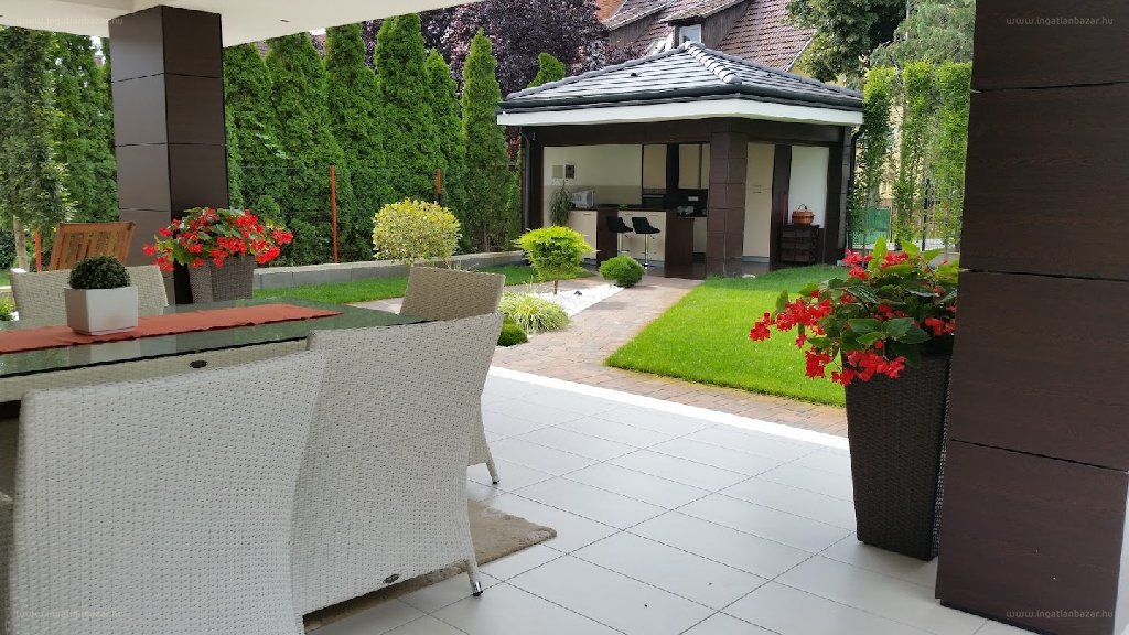 - kertben mindennel felszerelt grillkonyha, értékes növényekkel telepített kert, automata öntözőrendszer stb.,