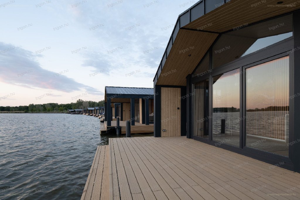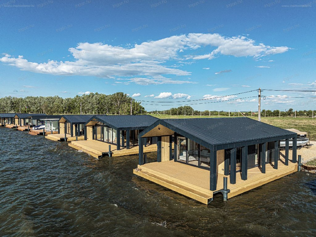 “A Tisza-tónál Abádszalókon az Abádi-Liget Úszófalu 2. partszakaszán panorámás 96 m2-es 2 hálórészes (48 m2 zárt rész + 48 m2 fedett terasz) úszóház eladó gyönyörű zavartalan környezetben. Ára: nettó 90 millió Ft + ÁFA. A házak rendelhetők nagyobb méretekben is: 144 m2-es (76 m2 zárt rész + 68 m2 fedett terasz) és 192 m2-es (102 m2 zárt rész + 90 m2 fedett terasz) úszóház. Az úszóházból csodálatos kilátás nyílik a vízre és a természetre, amit egész évben lehet élvezni, mivel a házak négyévszakosak, télen fűthetőek (távvezérelhető klima vagy fűtőpanel) és nyáron hűthetőek.