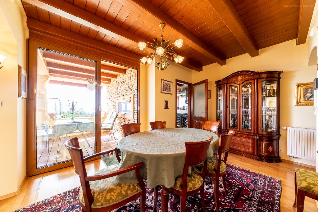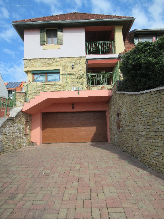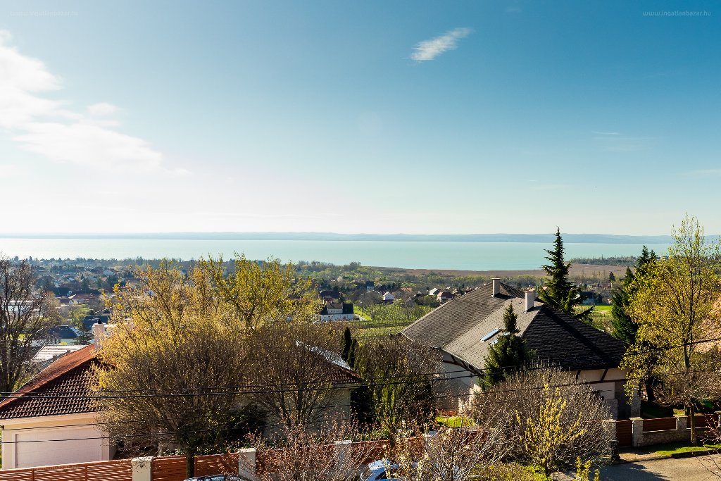 A garázs 2 autó részére lett kialakítva, a garázsból meglehet közelíteni, belső lépcsőn a lakószintet. A pince szinten ami 102 m2 nagyságú található a ház gépészete, kazánház-gáz kazán, meleg vizet a napkollektor biztosítja. Található itt barkács - műhely, tároló szoba, bor tároló. A lakószint 150 m2 nagyságú. Itt 2 hálószoba, konyha, nappali, étkező, WC, 2 fürdőszoba található. Az emelet 98 m2 nagyságú. Összesen a ház 5 hálószobás. A házban az étkező, a konyha, a könyvtár sarok kiemelt figyelemmel lett kialakítva, hiszen mindhárom helységből csodálatos rálátás van a Balatonra. Igényes beépített fa bútorok, tárolók, infra szauna, 3 rétegű ablaküvegek, hang és hőszigetelt nyílászárók emelik a ház minőségi besorolását. Kérem ha elnyerte tetszését az ingatlan keressen bizalommal. A házban kialakított kis apartman lehetővé teszi két generáció részére is az ott lakást..”[...]